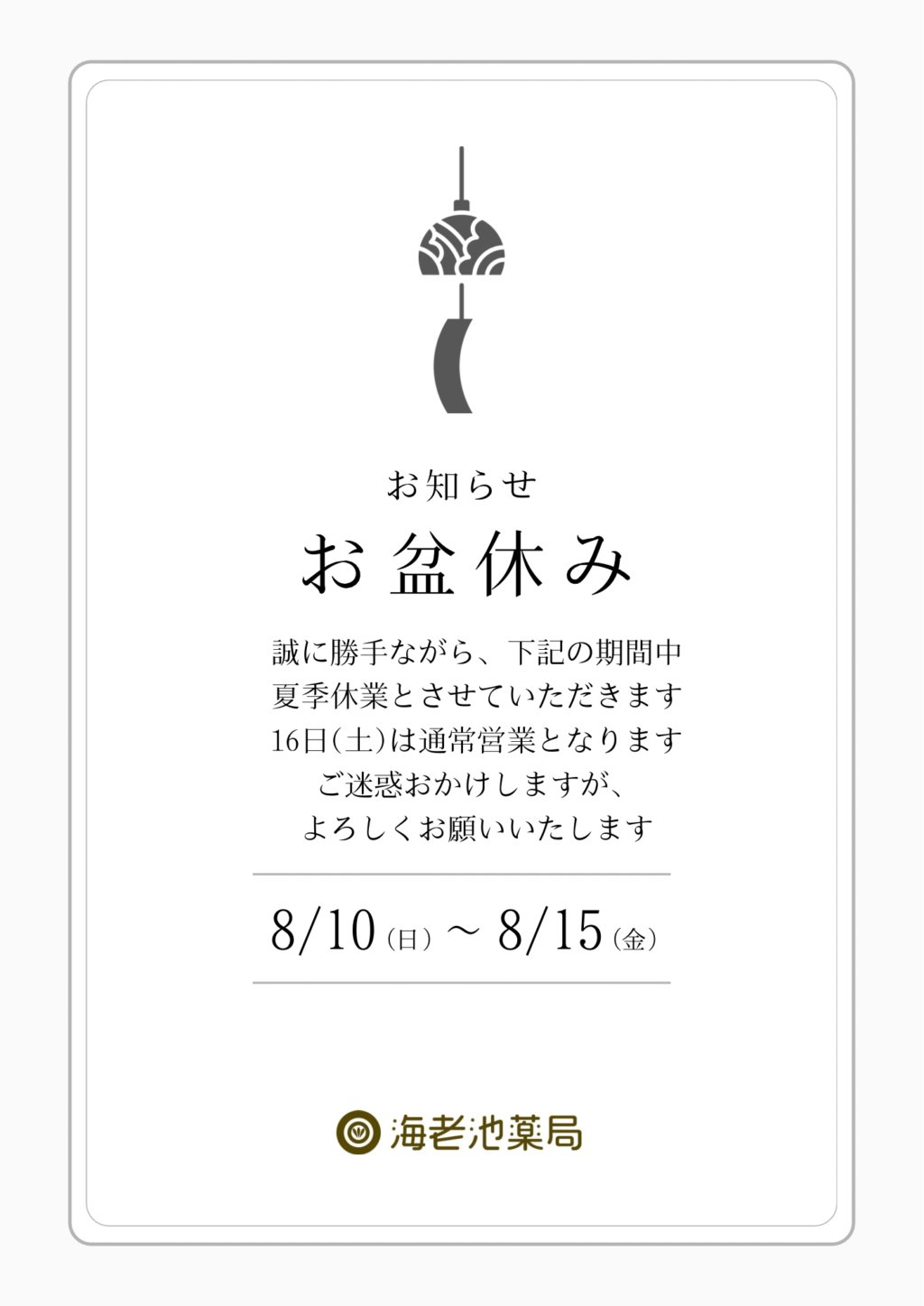 当薬局では、お盆期間中、下記の通り休業いたします。